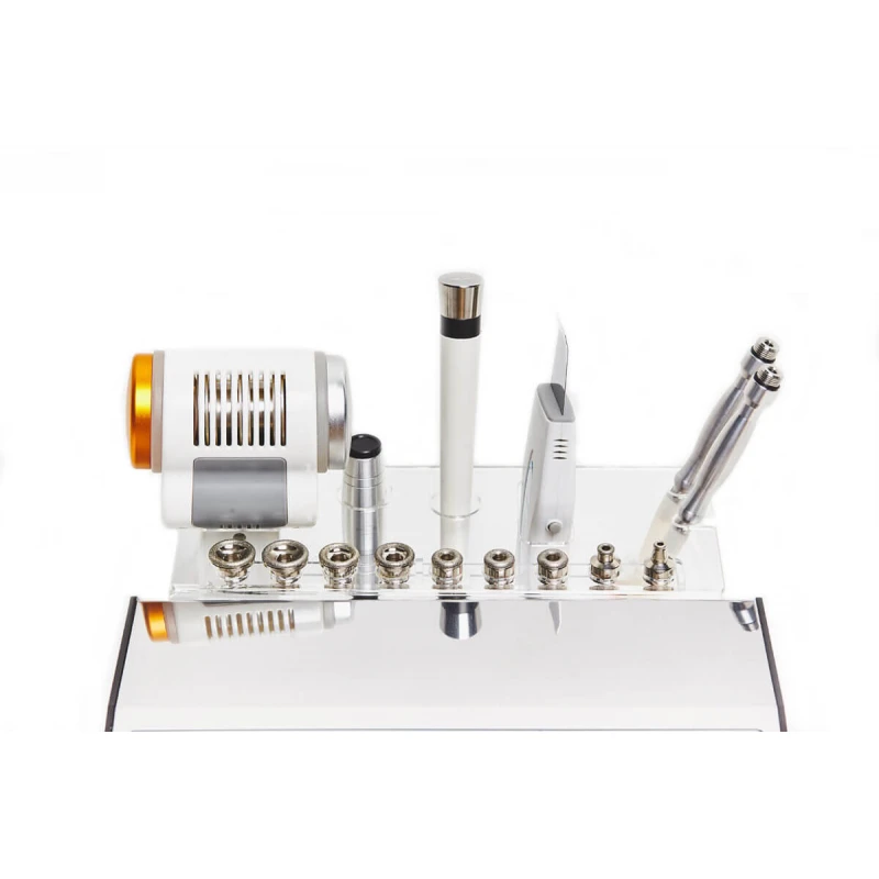 Equipo multifunción de estética proporciona un pulimento mecánico y renovación de la piel del rostro y del cuerpo. Para resolver estos problemas, el equipo se completa con puntas, cuya superficie está recubierta con polvo de diamante de varias fracciones (tamaño de grano). Pulen, limpian y suavizan el tegumento de piel, estimulando así su actividad celular. Y las partículas exfoliadas del estrato córneo se aspiran instantáneamente con vacío, dejando una sensación de frescor y renovación.